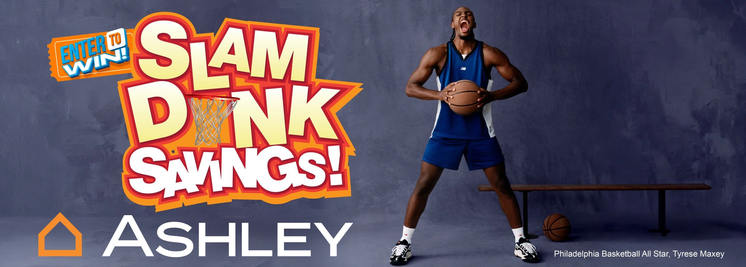 Alternate Method of Entry (No Purchase Necessary): To enter without making a purchase, visit www.AshleyFanCave.com during the Promotion Period and complete an official online entry form or mail your entry to Slam Dunk Savings, 9401 Blue Grass Road, Philadelphia, PA. 19114.